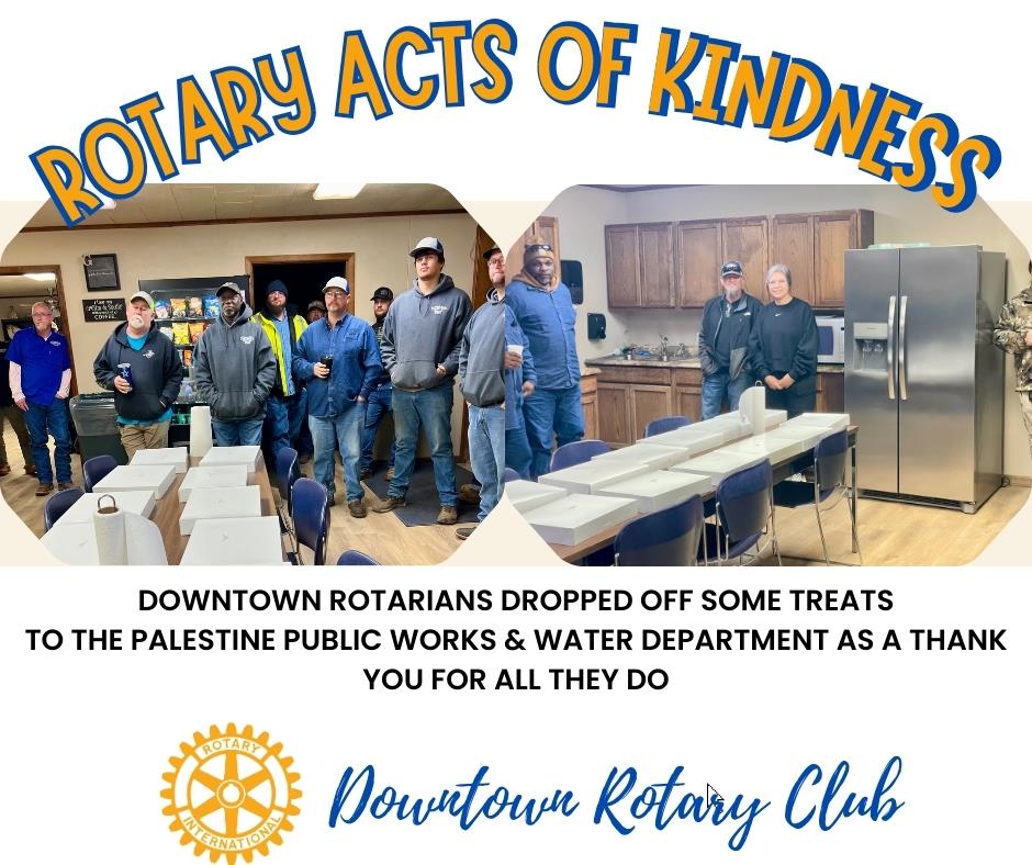 Downtown Rotarians stopped by with treats for the Palestine Public Works & Water Department to say thanks for all the behind-the-scenes work that makes a big difference